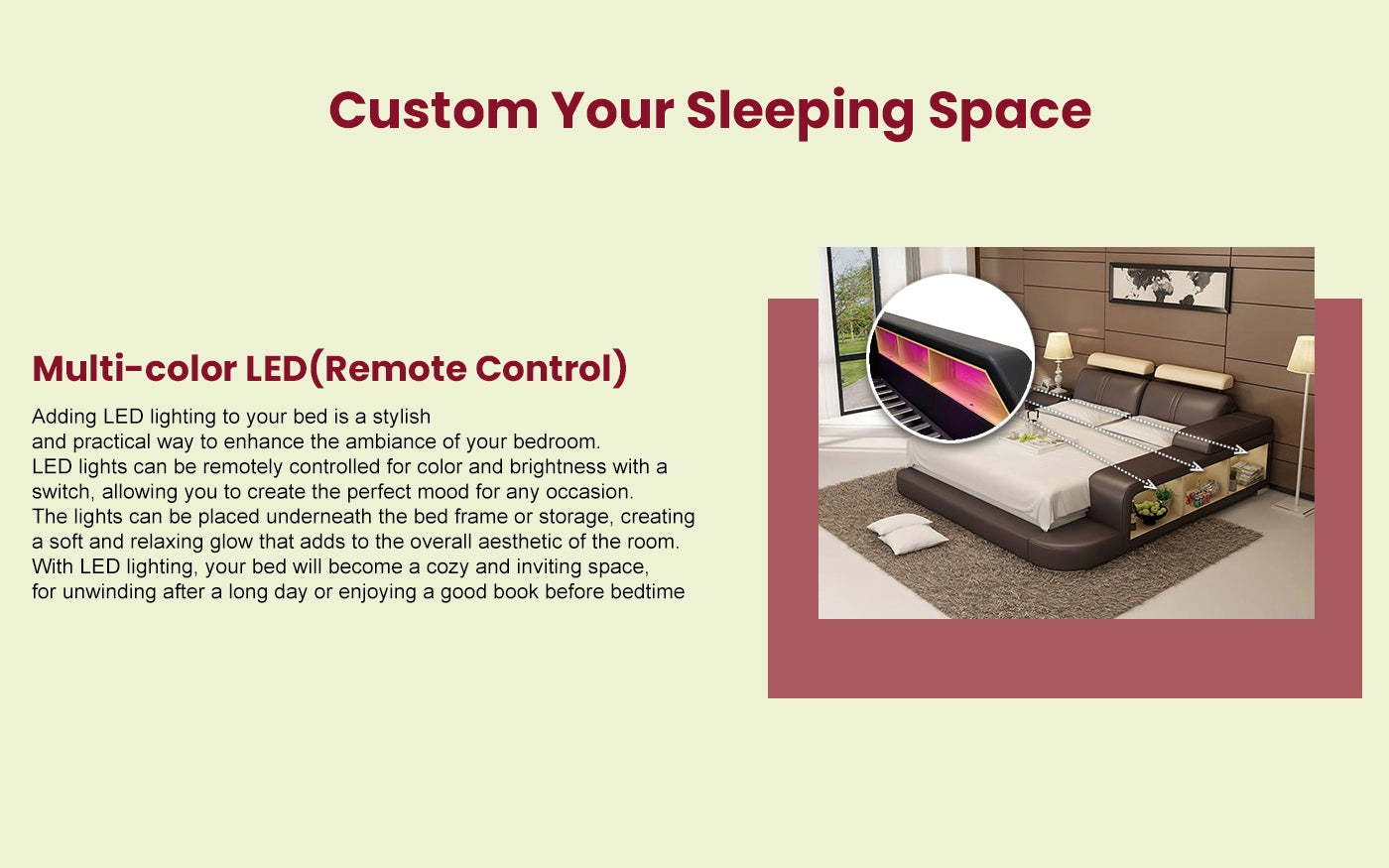 Adding LED lighting to your multifunction smart bed is not just practical but also a stylish upgrade for your bedroom. With remote control functionality for color and brightness adjustments, these LED lights offer versatility to suit any mood or occasion. Install them underneath the bed frame or storage compartments to create a soothing ambiance that enhances the overall aesthetic of your room. Transform your full-size smart bed into a luxurious retreat with this modern addition. Whether unwinding after a long day or indulging in bedtime reading, the soft glow from the LED lights will make your queen-size smart bed a cozy and inviting haven. Experience the perfect blend of functionality and elegance with LED lighting on your smart adjustable bed – a must-have feature for any modern bedroom.