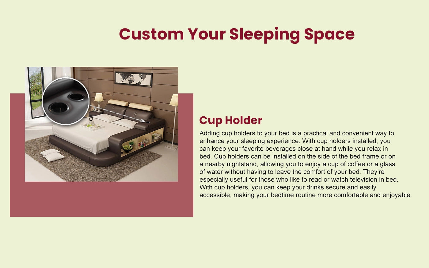 Enhance your sleeping experience with the addition of cup holders to your multifunction smart bed. These practical accessories provide a convenient solution for keeping your favorite beverages within reach while you unwind in bed. Whether installed on the side of the bed frame or a nearby nightstand, cup holders offer easy access to refreshments without the need to leave the comfort of your full-size smart bed. Ideal for reading or watching television in bed, cup holders ensure your drinks are securely held, enhancing the comfort and enjoyment of your bedtime routine. Upgrade your luxury smart bed with this modern convenience and elevate your relaxation experience to new heights.