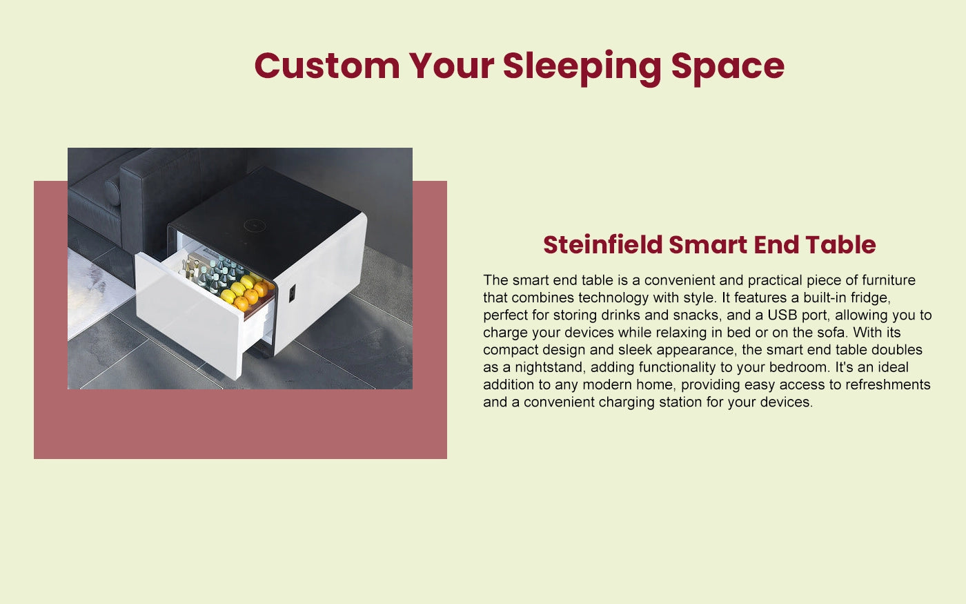 The multifunctional smart end table seamlessly combines technology and style, making it a practical and convenient addition to any modern home. This sleek piece of furniture boasts a built-in fridge, perfect for keeping drinks and snacks close at hand, and a USB port for hassle-free device charging while lounging on the bed or sofa. With its compact design, the smart end table also serves as a versatile nightstand, adding functionality to your bedroom setup. Whether used alongside a smart bed, full-size bed, or couch bed, its luxurious appearance and modern features enhance any living space. Say goodbye to clutter and hello to convenience with this must-have accessory, offering easy access to refreshments and a convenient charging station for all your devices