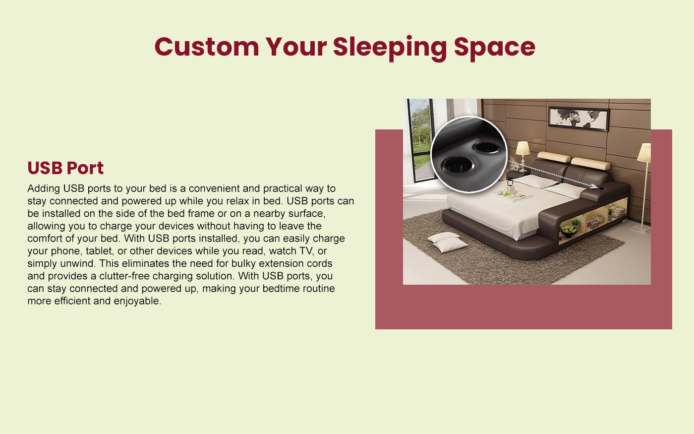 Adding USB ports to your multifunction smart bed enhances both convenience and practicality, offering a seamless way to stay connected and powered up while you unwind. These USB ports can be seamlessly integrated into the bed frame or positioned on a nearby surface, providing effortless access to charging your devices without leaving the comfort of your bed. Whether you're reading, watching TV, or simply relaxing, having USB ports installed ensures easy charging for your phone, tablet, or any other gadget. Say goodbye to tangled extension cords as USB ports offer a clutter-free charging solution, seamlessly blending with the sleek design of your smart bed. With this addition, your bedtime routine becomes more efficient and enjoyable, allowing you to stay connected and fully charged without any hassle.